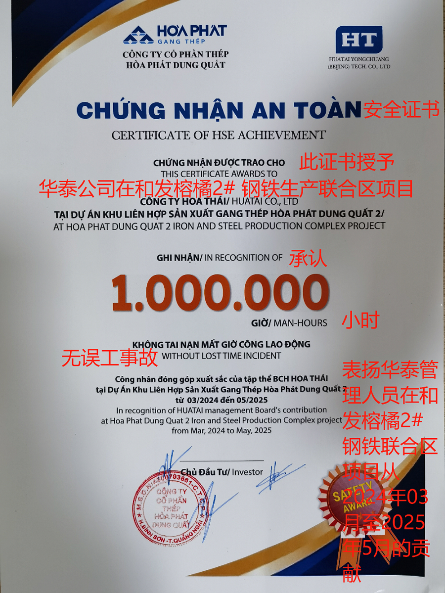 越南和发榕橘钢铁股份有限公司于2025年7月2日正式授予我司越南榕橘项目部《100万工时无误工事故安全嘉奖》,这是近年来唯一一次授予中国籍总承包公司。安全是合作共赢的基石,这项荣誉标志着我司安全管理工作赢得了业主方的高度认可,成为我司开拓海外总承包工程市场的又一金字招牌。